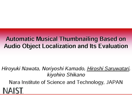 Přednášející: Hiroshi Saruwatari, Autoři: Hiroyuki Nawata, Noriyoshi Kamado, Hiroshi Saruwatari, Kiyohiro Shikano, Nara Institute of Science and Technology, Japan