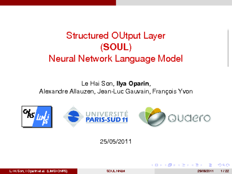 Přednášející: Ilya Oparin, Autoři: Hai Son Le, LIMSI CNRS / Uni. Paris-Sud, France; Ilya Oparin, LIMSI CNRS, France; Alexandre Allauzen, LIMSI CNRS / Uni. Paris-Sud, France; Jean-Luc Gauvain, LIMSI CNRS, France; Francois Yvon, LIMSI CNRS / Uni. Paris-Sud, France