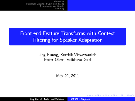 Přednášející: Steven Rennie, Autoři: Jing Huang, IBM T.J. Watson Research Center, United States; Karthik Visweswariah, IBM India Research, India; Peder Olsen, Vaibhava Goel, IBM T.J. Watson Research Center, United States