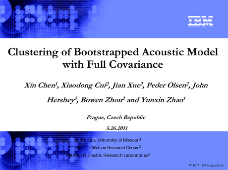 Přednášející: Xin Chen, Autoři: Xin Chen, University of Missouri, United States; Xiaodong Cui, Jian Xue, Peder Olsen, IBM, United States; John Hersey, Mitsubishi, United States; Bowen Zhou, IBM, United States; Yunxin Zhao, University of Missouri, United States