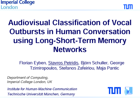 Přednášející: Stavros Petridis, Autoři: Florian Eyben, Technische Universitaet Muenchen, Germany; Stavros Petridis, Imperial College London, United Kingdom; Björn Schuller, Technische Universität München, Germany; George Tzimiropoulos, Stefanos Zafeiriou, Maja Pantic, Imperial College London, United Kingdom