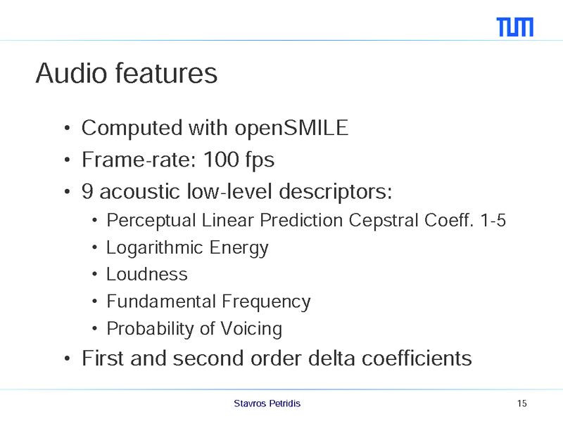 Presented by: Stavros Petridis, Author(s): Florian Eyben, Technische Universitaet Muenchen, Germany; Stavros Petridis, Imperial College London, United Kingdom; Björn Schuller, Technische Universität München, Germany; George Tzimiropoulos, Stefanos Zafeiriou, Maja Pantic, Imperial College London, United Kingdom