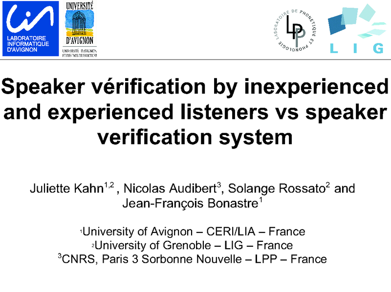 Přednášející: Juliette Kahn, Autoři: Juliette Kahn, University of Avignon, France; Nicolas Audibert, Laboratoire de Phonétique et Phonologie, France; Solange Rossato, University of Grenoble, France; Jean-François Bonastre, University of Avignon, France
